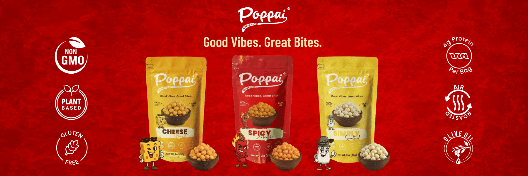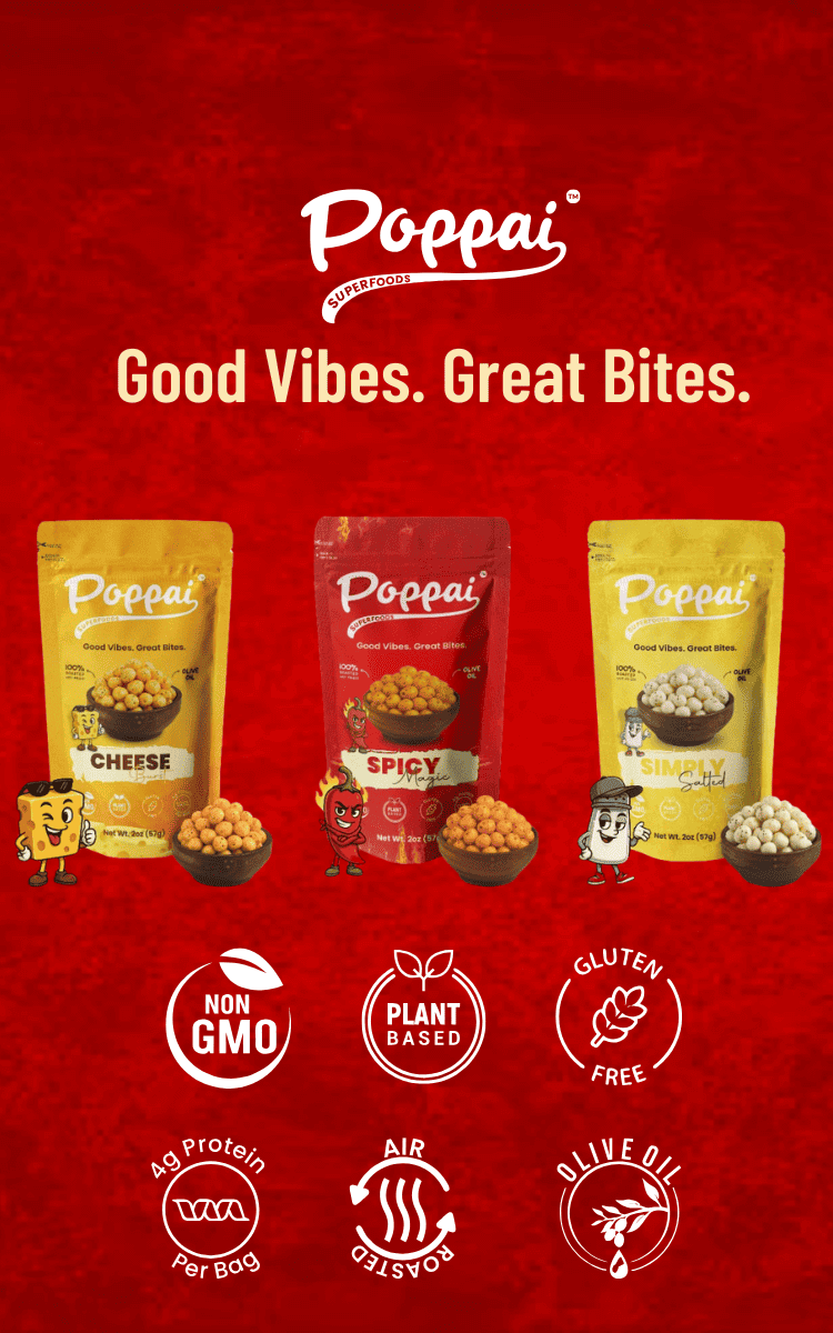 We believe snacking should be simple, satisfying, and smart. That’s why Poppai snacks are made with clean, plant-based ingredients, air-roasted to perfection, and bursting with bold flavors you’ll love. Whether you're fueling your day or treating yourself guilt-free, Poppai has your back (and your crunch). Explore the feel-good benefits that make our fox nuts the smarter way to snack.